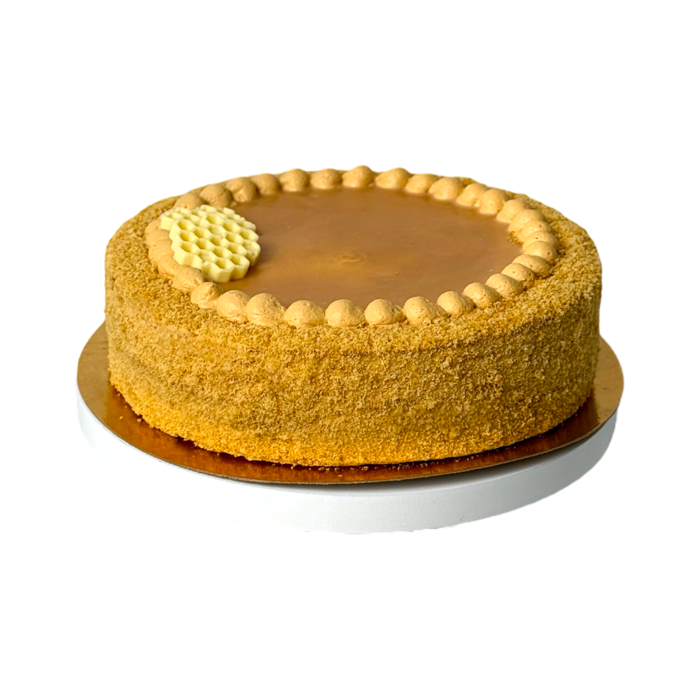 Классический медовик в нежнейшем исполнении: ароматные, тонкие коржи на натуральном мёде, пропитанные воздушным кремом с тонкой карамельной ноткой. Каждая ложка — как тёплое домашнее воспоминание, наполненное мягкостью, сладостью и уютом.