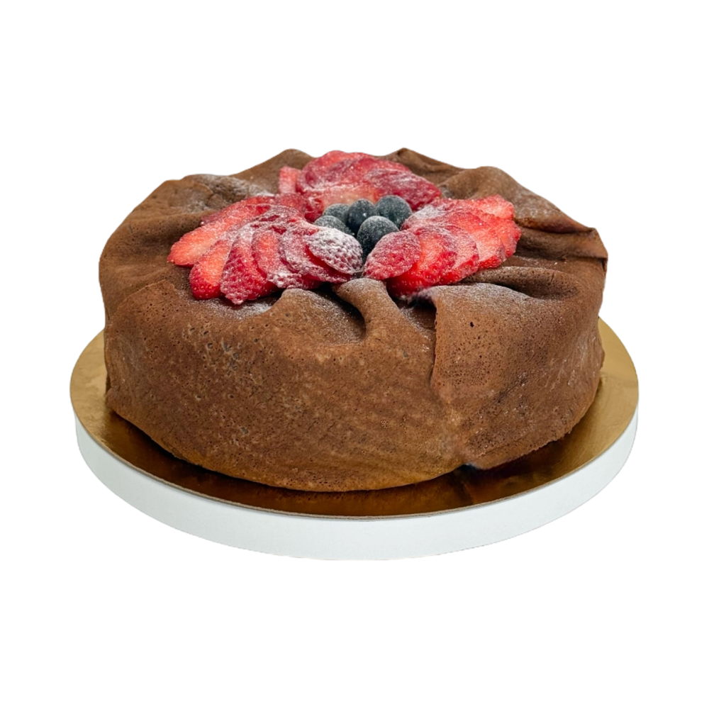 Изящный десерт с насыщенным шоколадным вкусом: тончайшие блинчики с добавлением какао, прослоенные нежнейшим кремом со вкусом пломбира. Сверху — свежие фрукты, которые придают яркость и сочность. Этот торт не только вкусен, но и невероятно эффектен в подаче.
