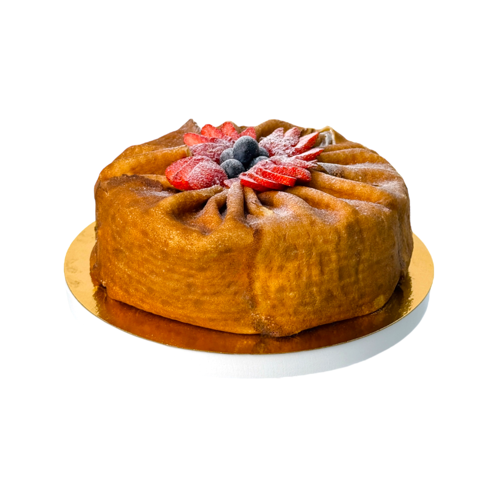 Нежный, легкий и очень домашний десерт: тонкие, румяные блинчики, щедро прослоенные сливочным кремом с вкусом пломбира. Завершающий штрих — свежие ягоды на верхушке, добавляющие сочности и яркости.