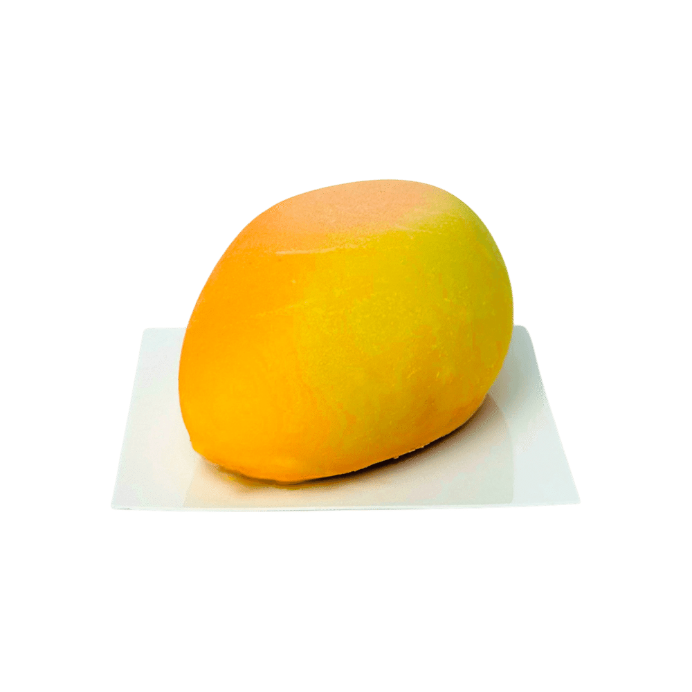 Корпус из белого шоколада, ванильный бисквит с хрустящим слоем, крем манговый, начинка из мангового пюре.