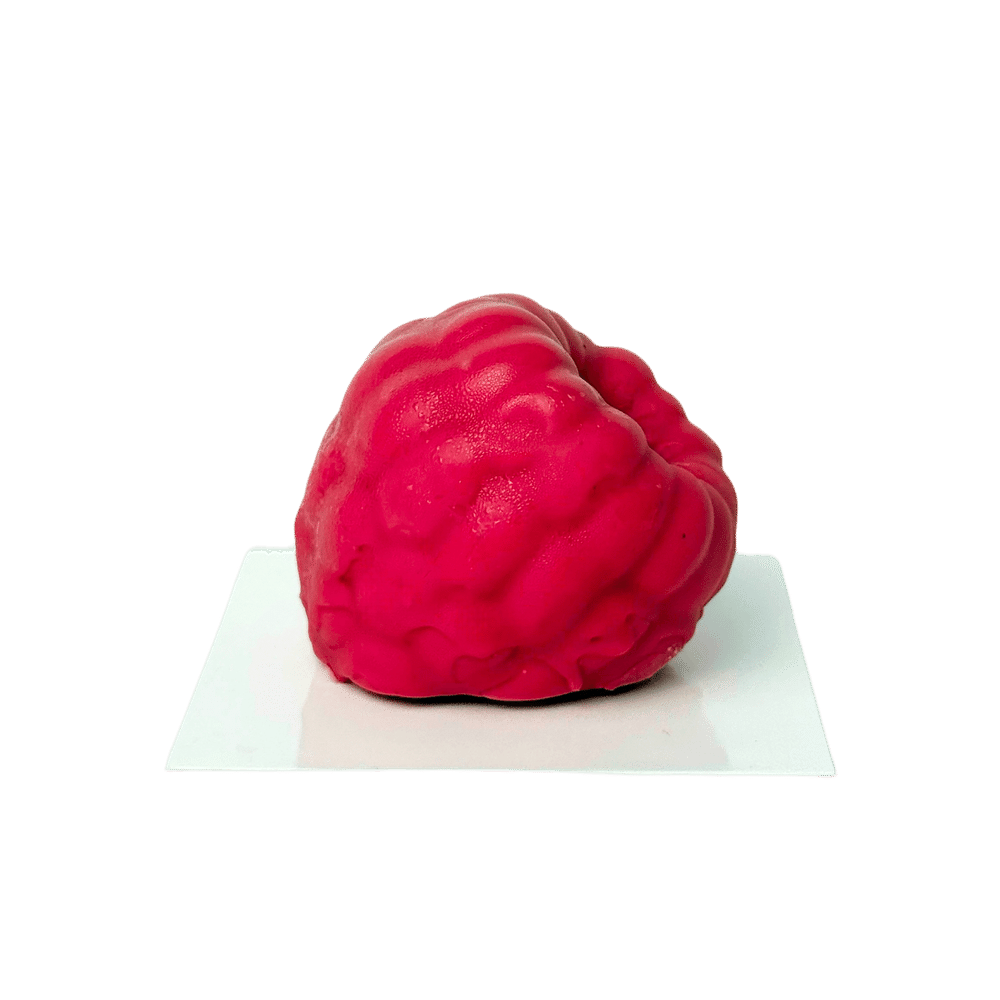 Корпус из белого шоколада, йогуртовый малиновый крем, начинка из малины с кусочками малины.