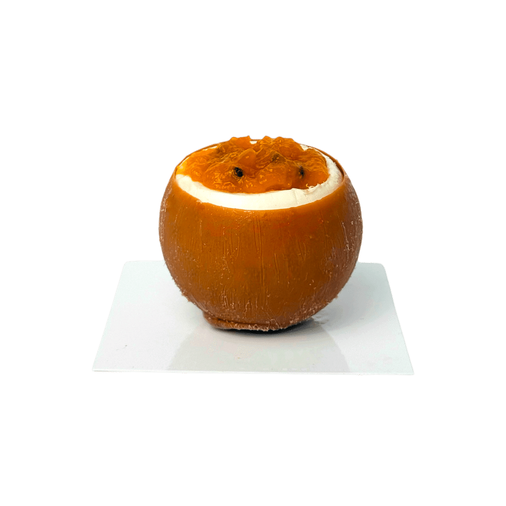 Корпус из молочного шоколада Callebaut Нежная начинка из манго Воздушный ганаш на кокосовом молоке Сверху яркий гель из маракуйи.
